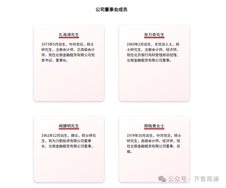 目前,北银金租官网仍然显示孔海涛为该公司董事长。孔海涛,1973年5月出生,现任北银金融租赁有限公司党委书记、董事长。此前,孔海涛曾任北京银行济南分行副行长、青岛分行行长。